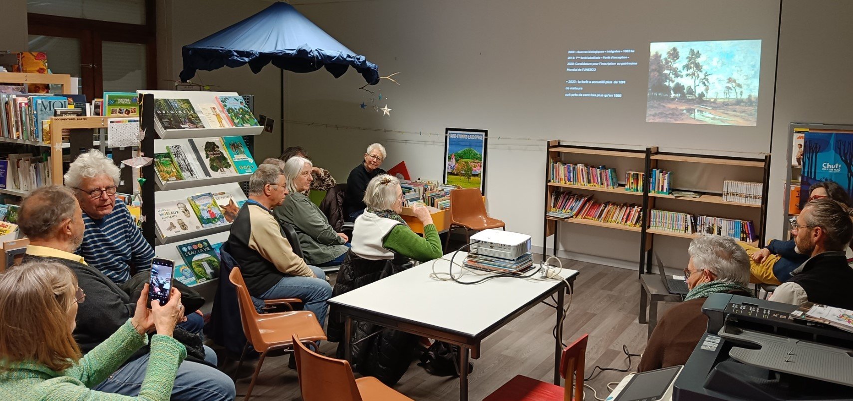 Ce vendredi 19 avril, dans la sympathique bibliothèque de St Etienne-Lardeyrol, Anne Muller a fait revivre, pour un petit public très attentif, le lien indéfectible entre les peintres du 19ème siècle et la célèbre forêt de Fontainebleau.