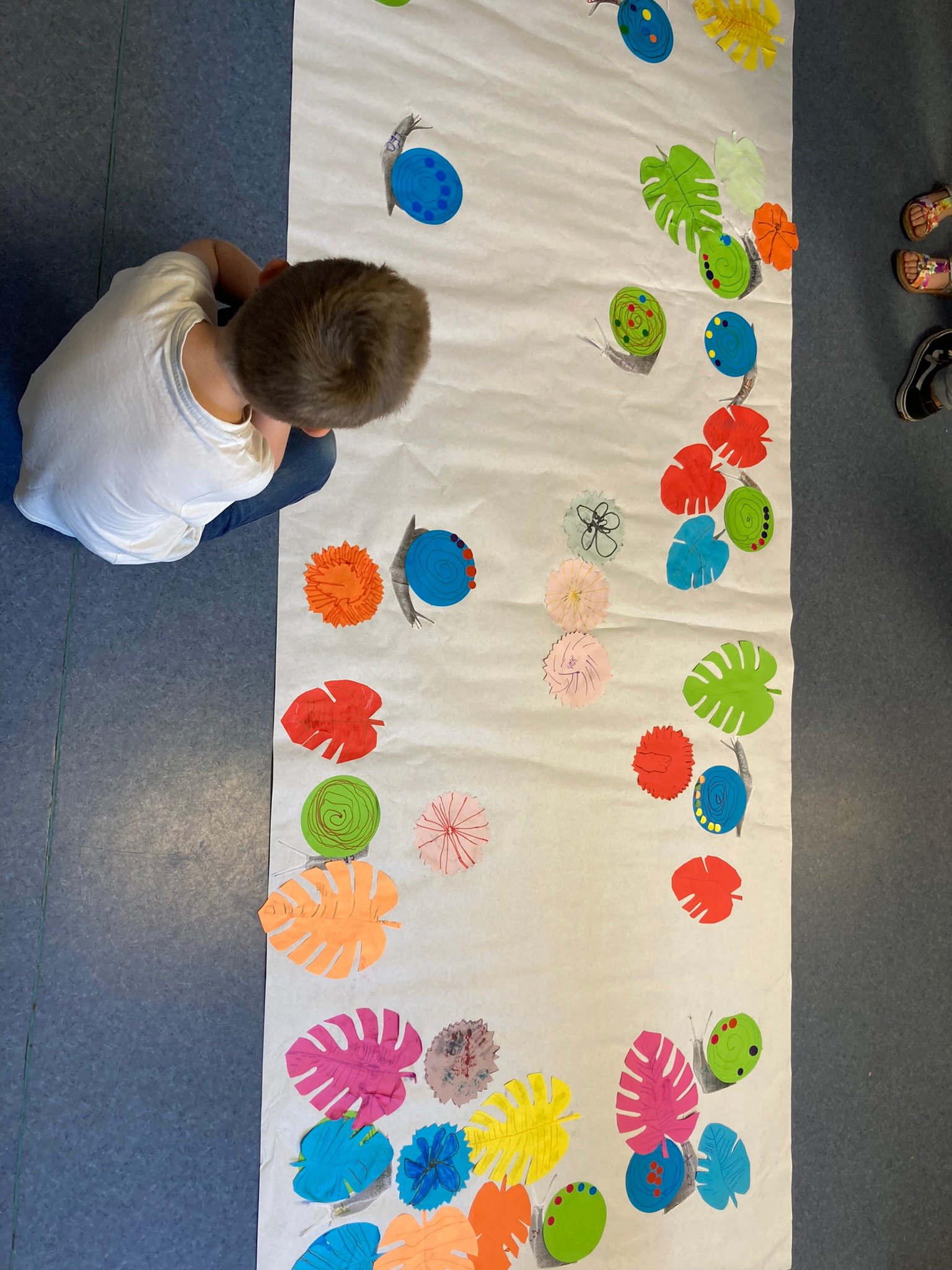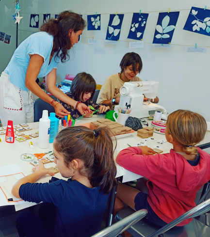 Animation pour les enfants dans la bibliothèque décorée de Cyanotypes.