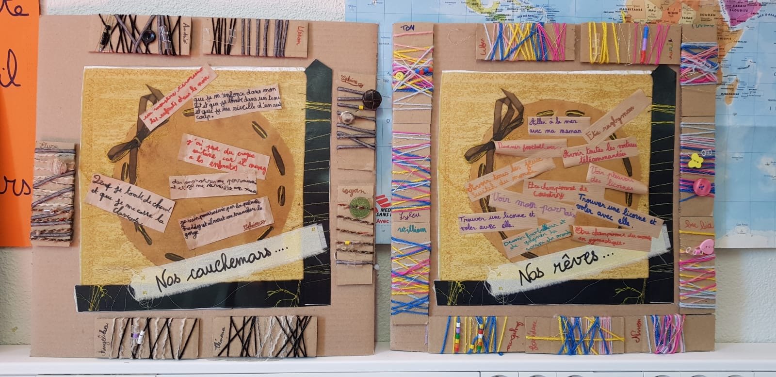 Les élèves se sont départagés en 2 groupes sur chacun des thèmes. Ils disposaient d'un carton qu'ils devaient habiller de laine, de boutons et de perles (les couleurs et les décorations sont choisies en fonction des émotions ressenties par les rêves ou les cauchemars).