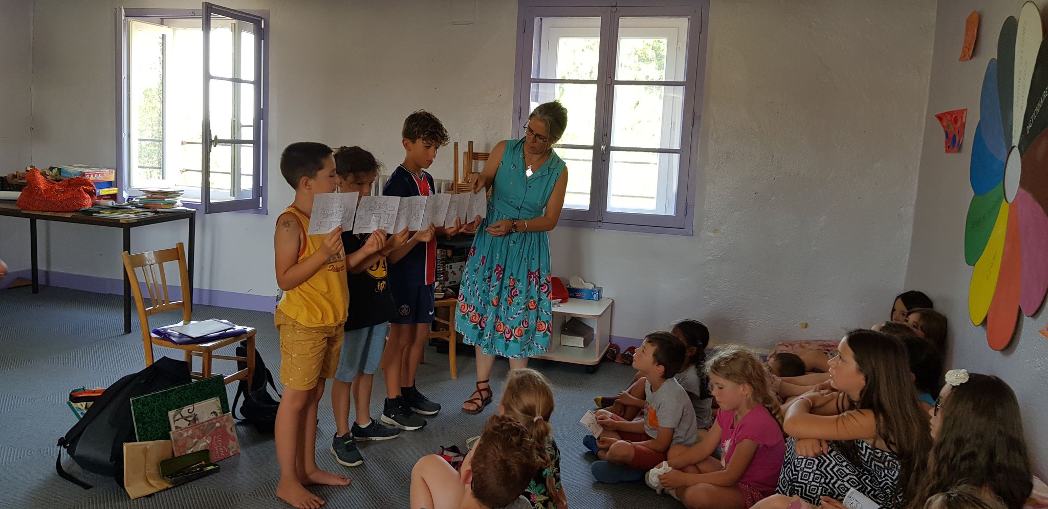 Après une écoute attentive et de nombreuses questions, les enfants se sont mis au travail pour réaliser une fresque initiée et commentée par Marion JANIN.