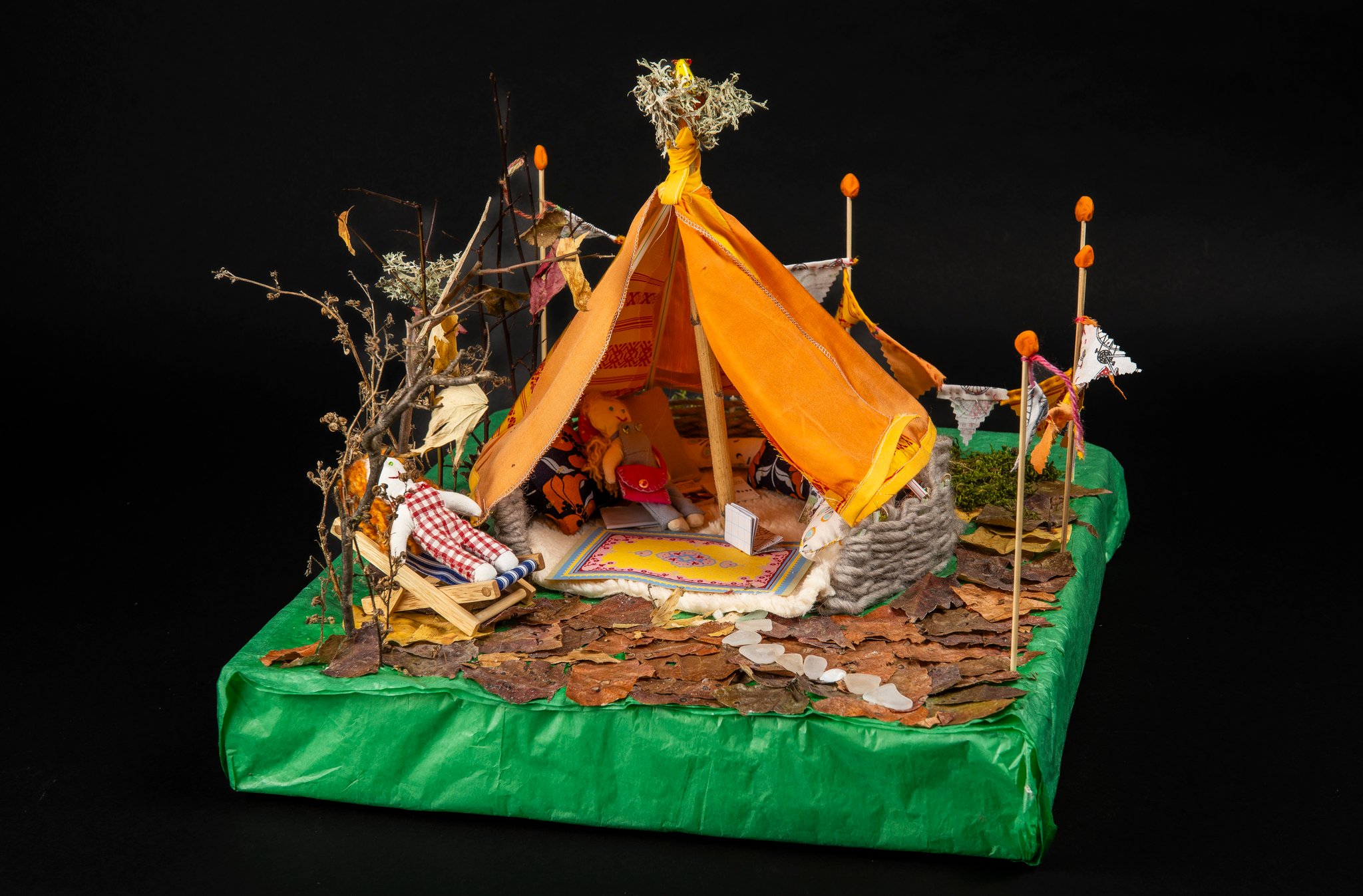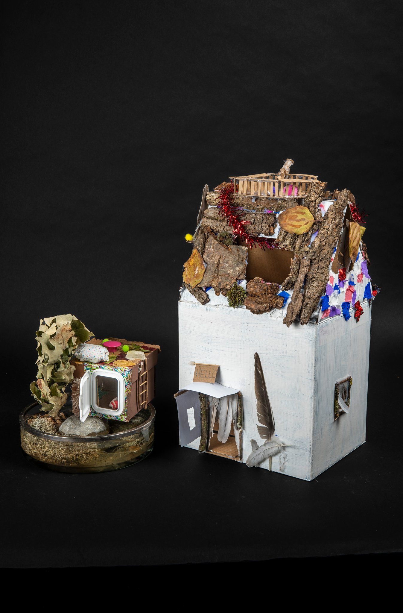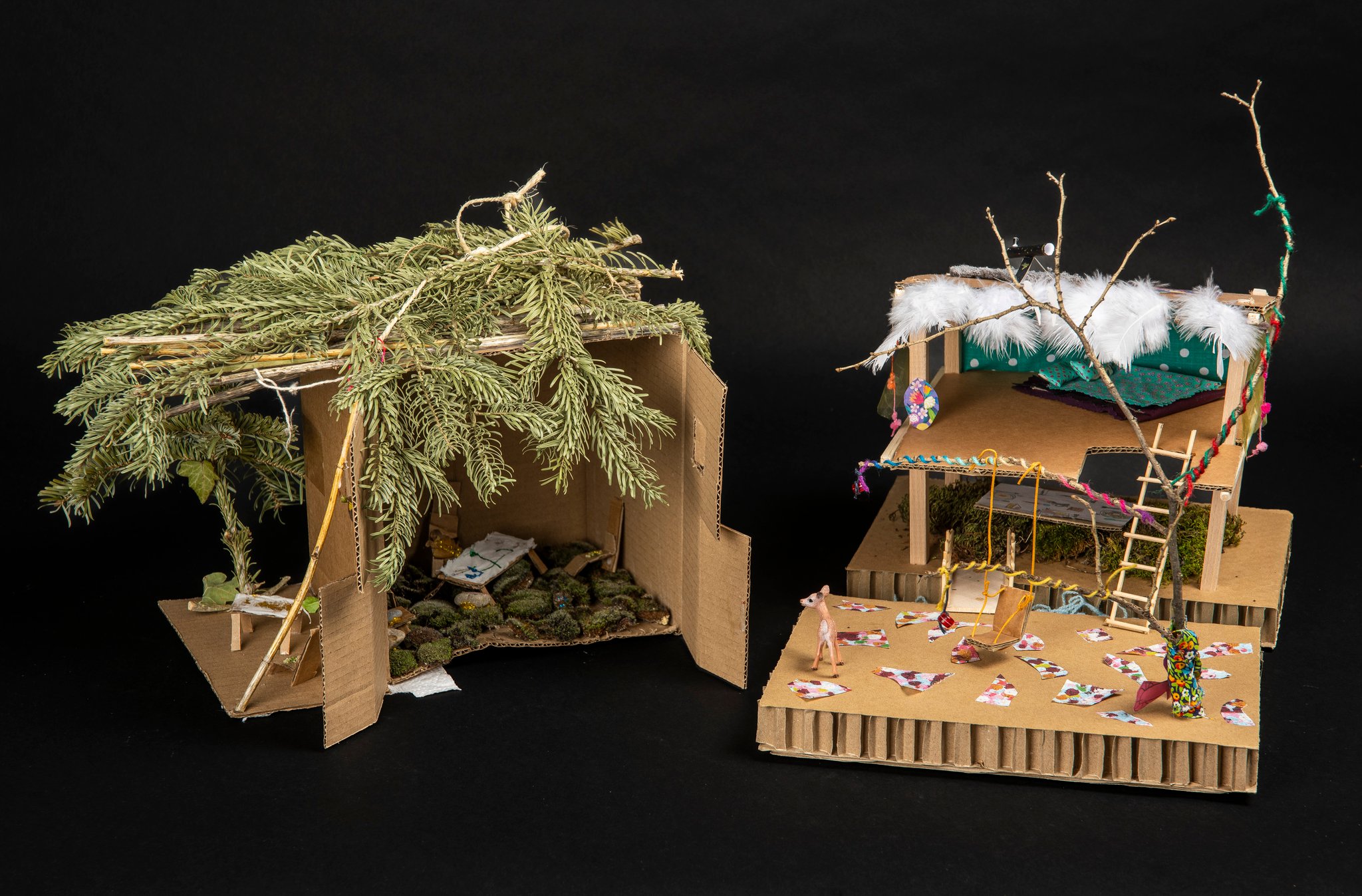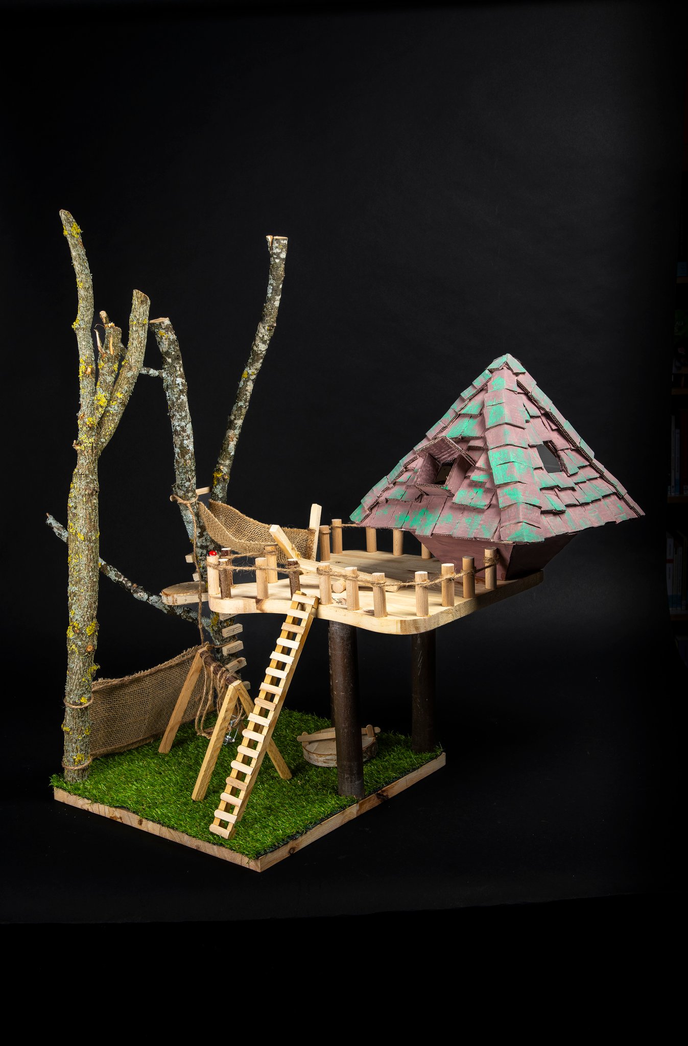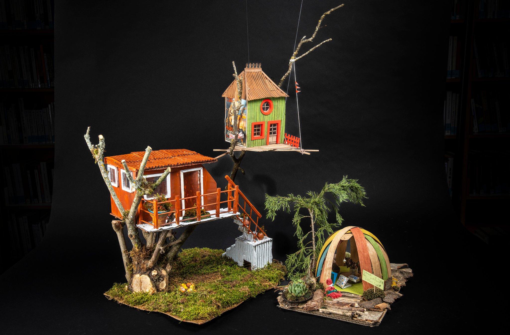 Mi septembre, le projet était lancé et trois mois plus tard quarante cinq cabanes ont pris place dans la médiathèque. Chaque réalisation était soignée, originale et personnelle. Pour les enfants ce fut l’occasion d’un véritable projet familial avec cueillettes dans la forêt, bricolage à la maison ou à la médiathèque.