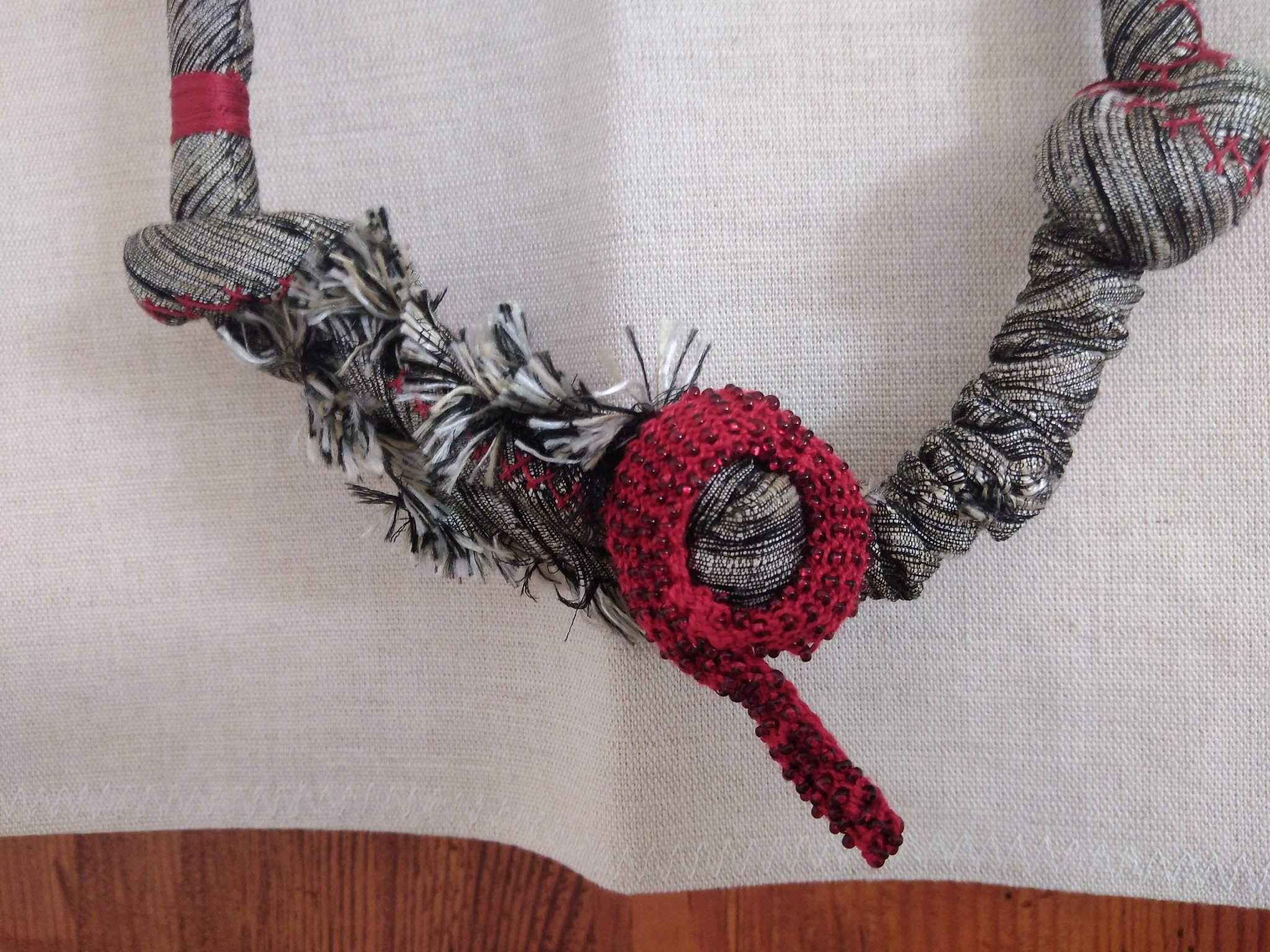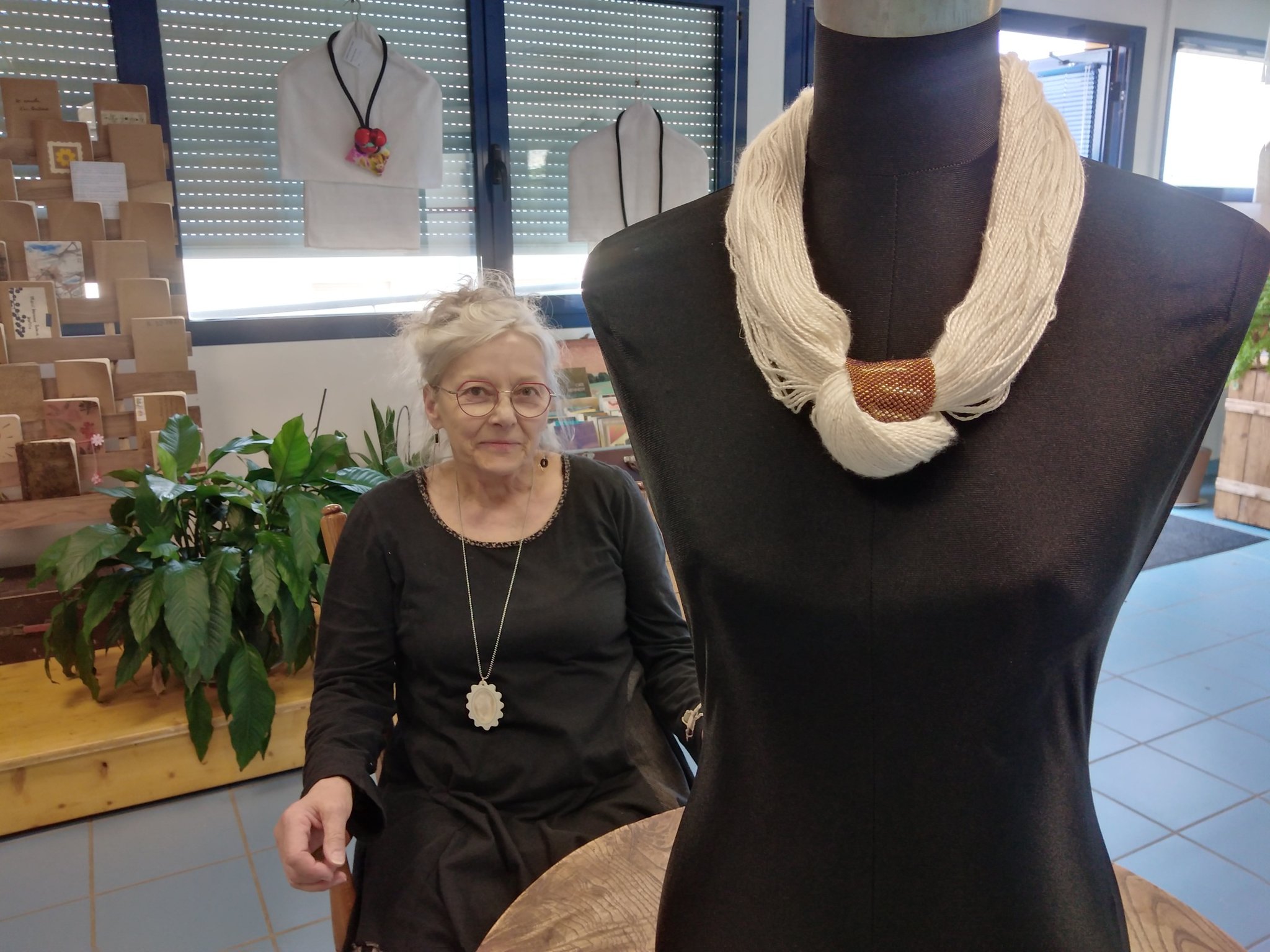 « J’ai une passion pour les perles depuis ma plus tendre enfance. Les détournant de leur usage habituel, je formais étoiles, rosaces et autres circonvolutions éphémères… Jouer avec les couleurs me captivait. J’étais sensible aux harmonies et aux formes composées. Depuis cet éveil, m’appropriant de nouvelles techniques, mon travail a évolué et s’est enrichi. Chaque trouvaille, chaque découverte devient source d’inspiration. A présent, je confectionne mes propres perles utilisant tissu, fibres … mais aussi raku… Mes créations sont des parures ou des structures. Ce sont des compositions artistiques jouant sur les contrastes de matière et les harmonies de couleurs. C’est la matière qui m’inspire et me fait vibrer, qu’elle soit fibre, textile, élastiques… Au cours des années, j’ai osé intégrer dans mes créations des mélanges incompatibles à priori et présenter des formes inattendues. La plupart de mes pièces sont ludiques et modulables.Elles étonnent par leur légèreté.