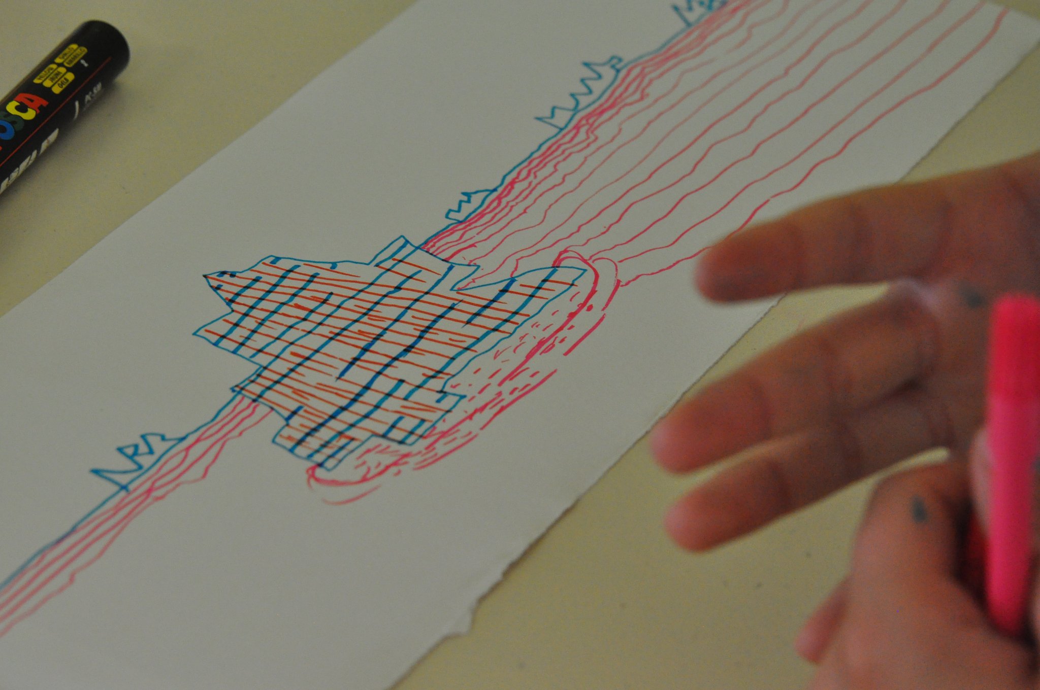 Après les discussions, la technique. Marie a proposé à chaque élève de travailler sur une longue feuille au format panoramique qui dépassait largement leurs petits bureaux. Ils ont tracé la ligne d’horizon, réfléchit à la perspective en dessinant tantôt devant, tantôt derrière cette ligne, des icebergs, des rochers, un ponton.... Il ont rendu le mouvement de l’eau, les vagues, la mer, le ciel, les nuages, tout cela avec de simples feutres. Pas de coloriage mais des lignes patiemment tracées sur le papier. Le résultat était bluffant. Une fois terminé et plié en accordéon le travail de chacun deviendra un joli Leporello.