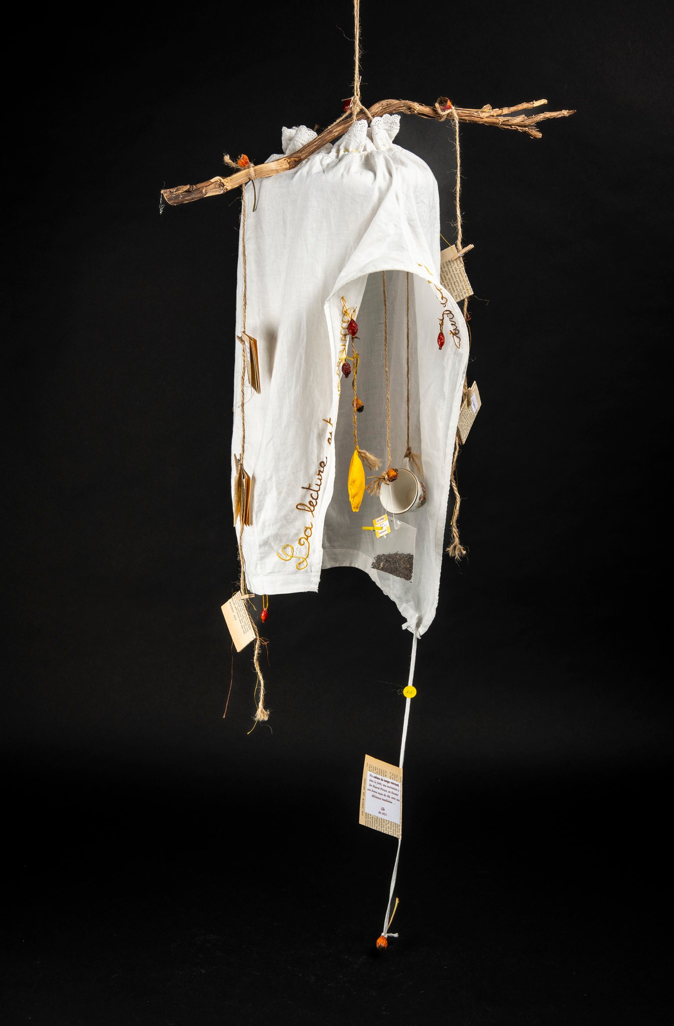 Une nappe brodée, quelques tasses en porcelaine, des petites madeleines sur une assiette, un livre carré, un portrait de Marcel Proust, deux dés en tissu, une assemblée bigarrée tout cela pour un atelier philo mené de main de maître par Claudine Guilhot.