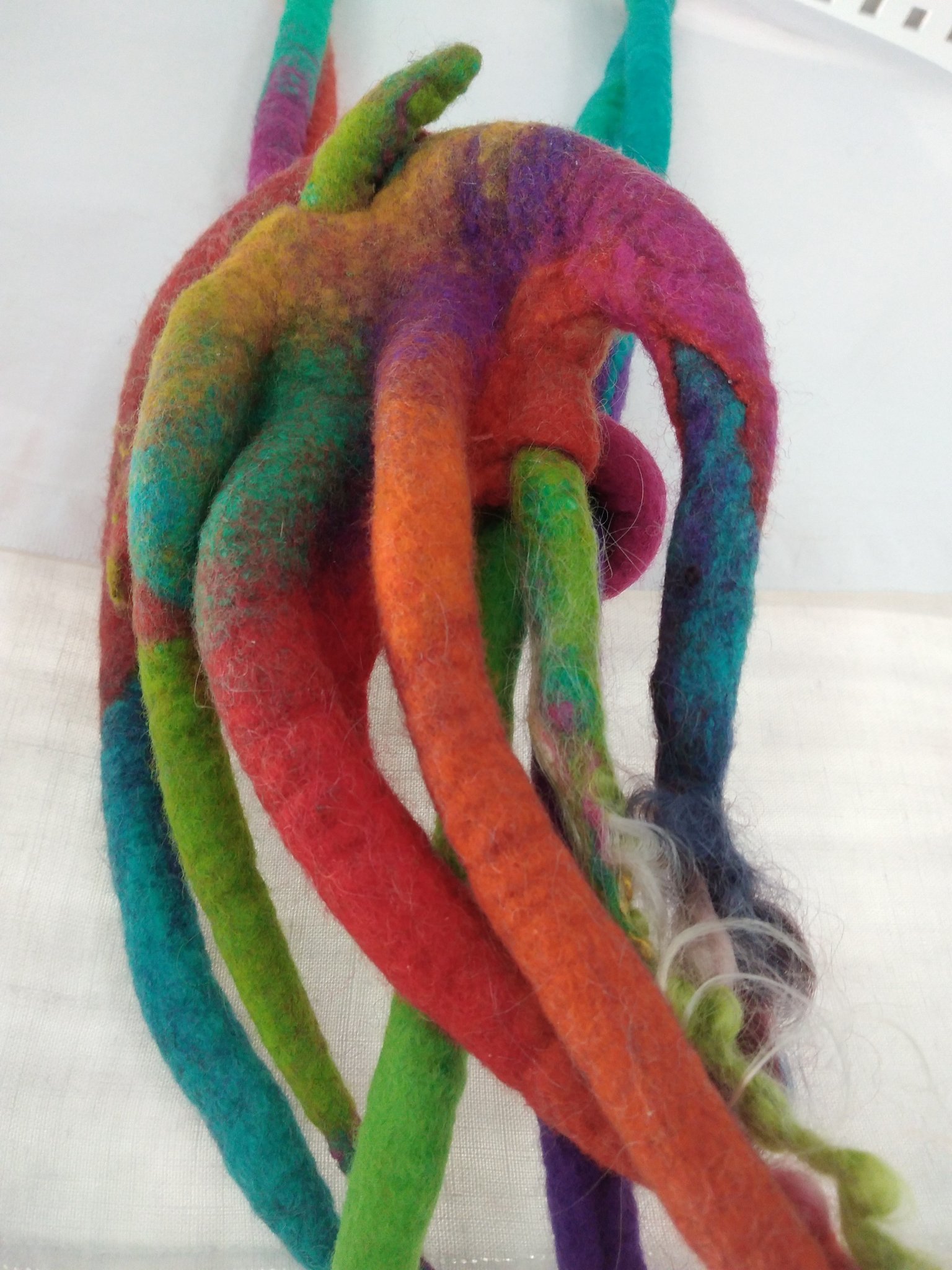 Actuellement, mon orientation se tourne vers la création contemporaine. Ces dernières années, j’ai découvert une technique nouvelle pour moi : le feutrage. La laine, comme la terre, est malléable, vivante, souvent rebelle au départ, elle finit par se laisser dompter. Mais cela prend du temps et de la patience. J’aime travailler en fonction d’un thème proposé. C’est le côté créatif et le travail de recherche qui m’intéressent. J’ai pu observer au cours de différentes expositions (rencontres avec différents publics), que mon travail pouvait provoquer une certaine émotion. »