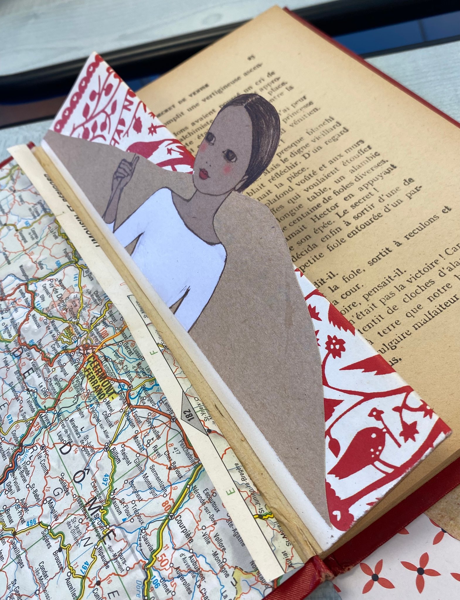 courbes, des couleurs, idée de voyage), des dessins tirés d’encyclopédie, des papiers aux motifs variés, des pages découpées dans des magazines inspirants, des cutters, des paires de ciseaux, de la colle et d’autres bricoles choisies avec soin.