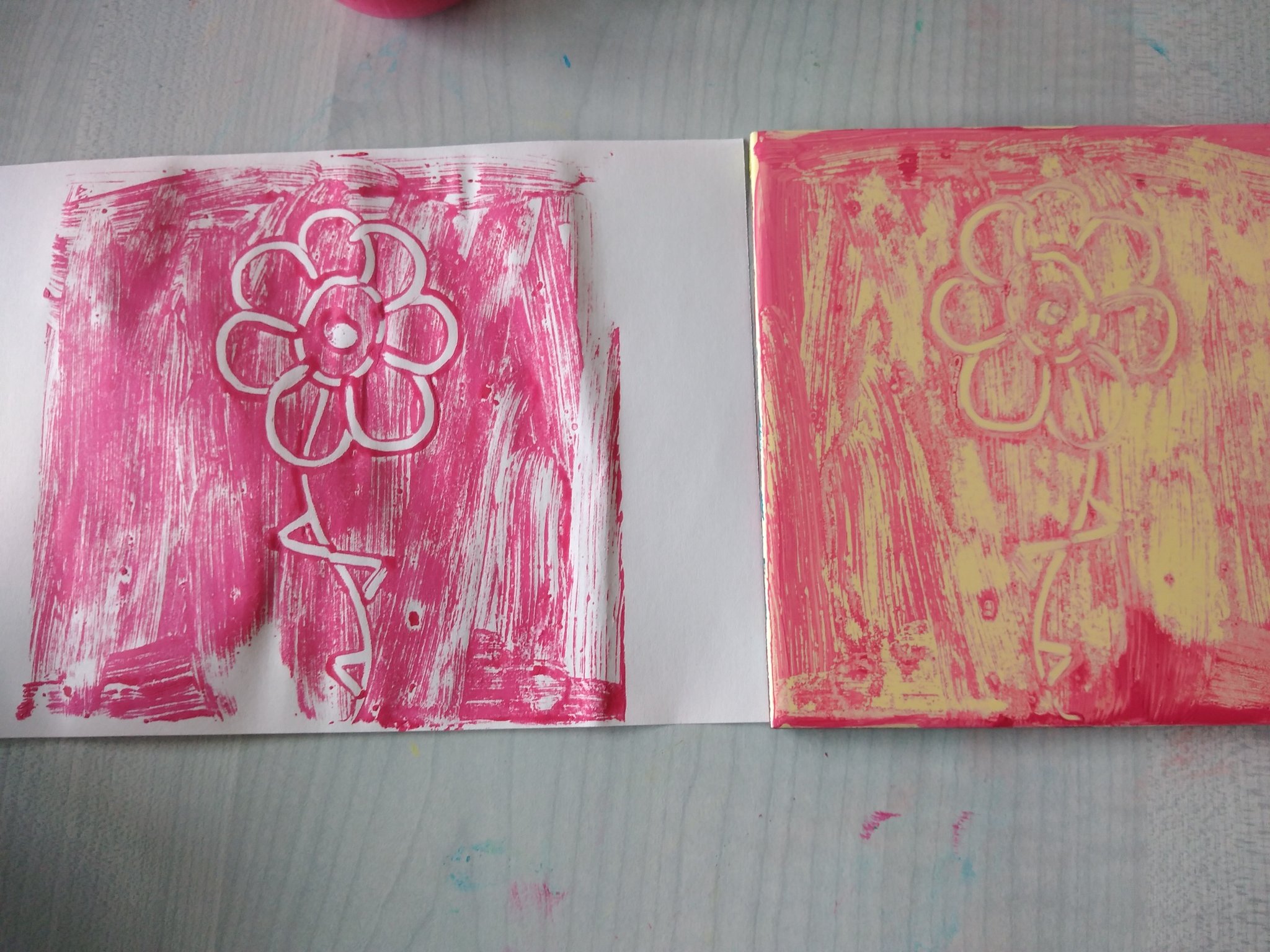 Il s'agit d'une technique d'impression qui consiste à peindre à la gouache (à l'encre ou à la peintre à l'huile) sur un support comme du verre ou du métal. Ce jour là les enfants ont utilisé des carrés de faïence.