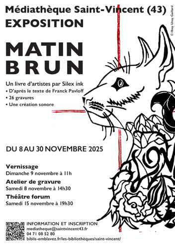 Le livre d’artiste Matin brun est exposé à la médiathèque de Saint-Vincent (43800) du 8 au 30 novembre 2025.